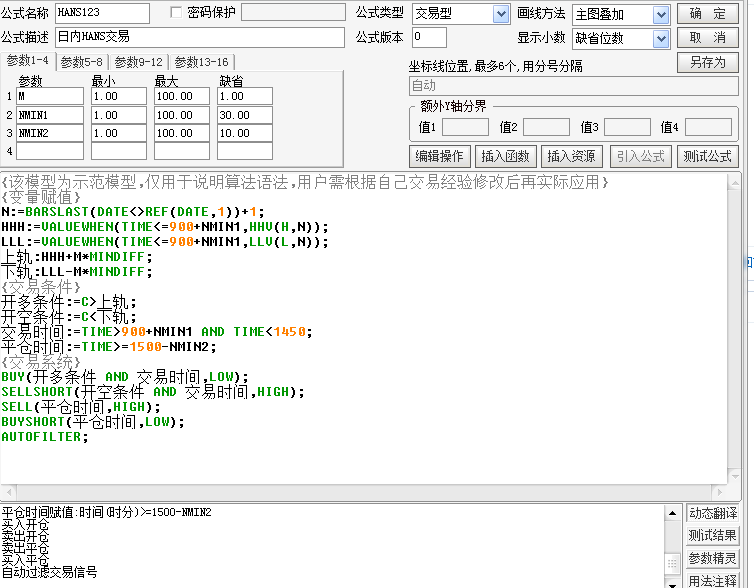 上轨:=VALUEWHEN(CROSS(TIME>=0930&&TIME<1500,0.5),HHV(H,N));//开盘30分钟最高价