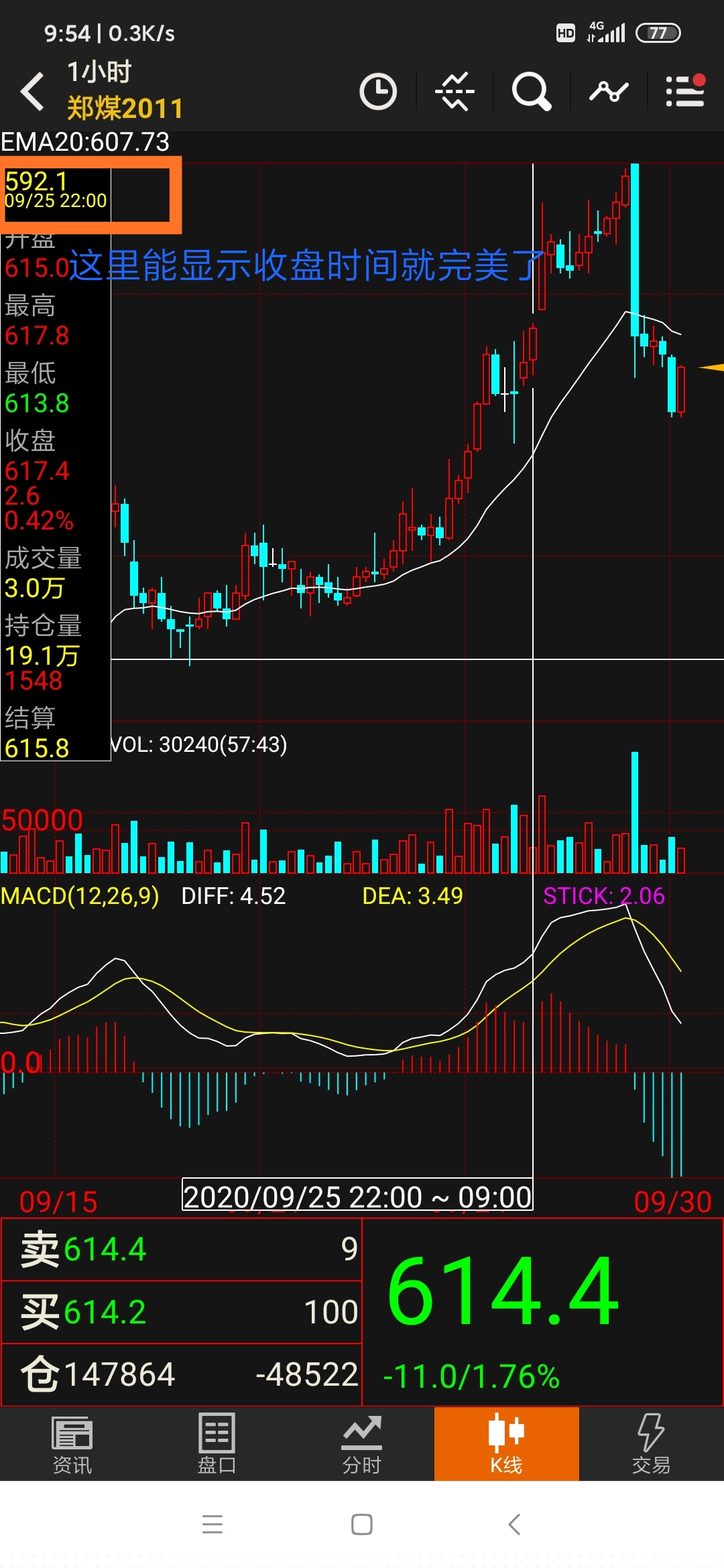 而我们需要的是收盘的那个时间点没有在左侧信息提示框显示出来。希望能后期版本能升级改善,比如我要做一小时或半小时看趋势,15或5分钟来操作买点,随时要查看一小时或半小时的收盘时间很重要,希望把左侧信息栏提示的时间更新为单根K线的收盘时间,就完美了,其他没有任何问题,确实这个软件非常优秀,就这个使用很不方便。
