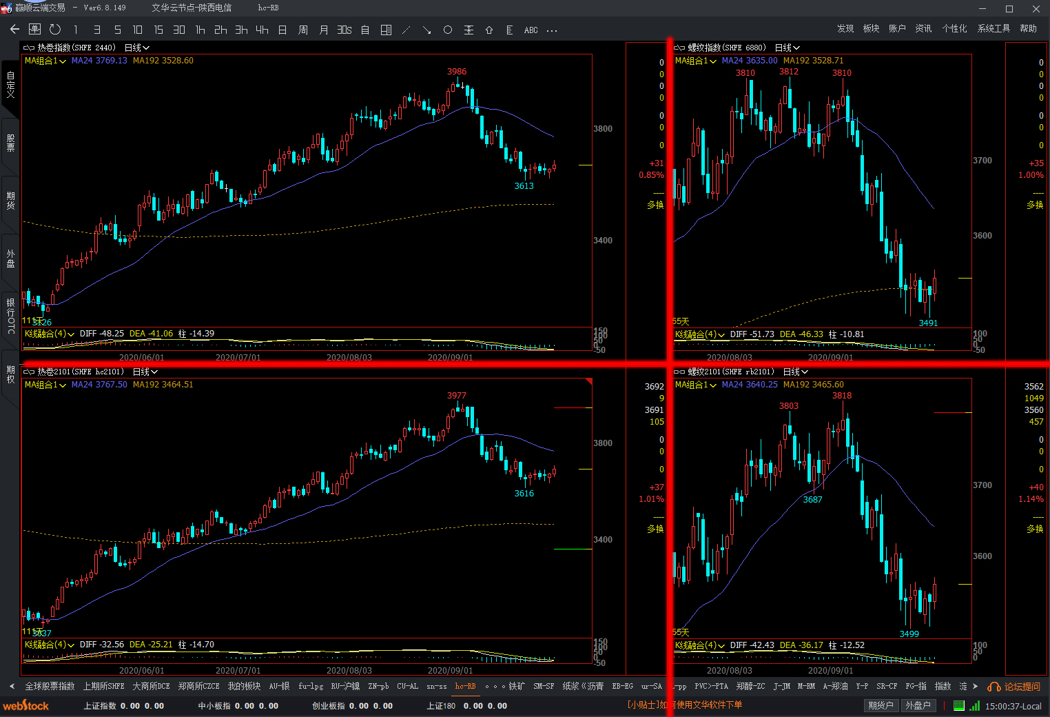 我自己设置的窗口排布如下图1,在1080的分辨率下,分成等比例的4个窗口,如果我把显示器分辨率调整到比如1024X768,软件会自动把这4个小窗口调整到还是一样大,但是如果显示器分辨率还是1080,我只是将软件窗口变小,这个时候这4个窗口就不一样大了(参见图2里红十字分出的四个窗口,不一样大,看起来很不方便),有没有什么设置能在我将软件窗口调整小后,自动将这四个小窗口调整到一样大,就类似于我调整了显示器的分辨率一样来自适应?