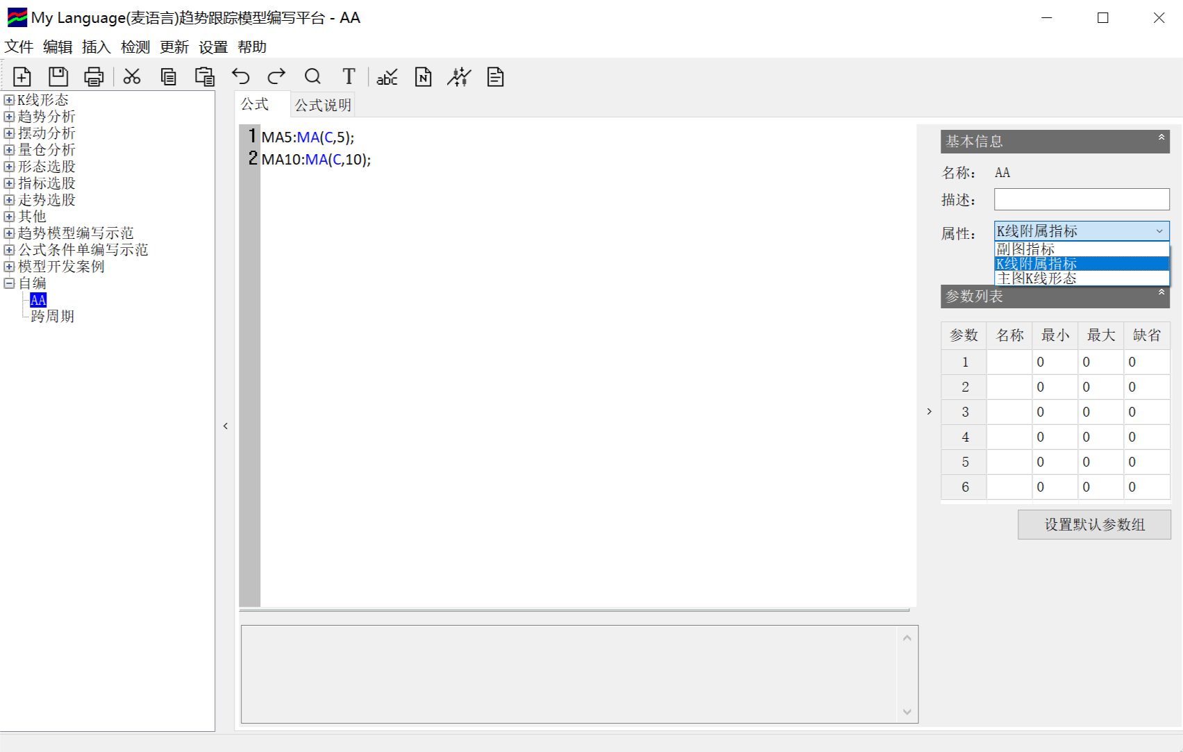 [求助][讨论]主图附加指标 (文华财经)投资者咨询:[求助][讨论]主图附加指标 (文华财经)来源:文华财经 日期:2020-10-4 12:00 在公式编辑器界面,左边选择“自编”,然后新建一个指标。在右边“基本信息”——“属性”这里,没有“主图附加指标”这个选项。 请问应该怎样实现自己编写一个指标,让它作为主图附加指标显示出来呢? 如图所示: 文件名:123.png技术人员回复日期:2020-10-4 13:11 k线附属指标 就是主图附加的意思 您了解下