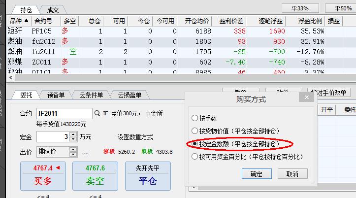 固定金额开仓 (文华财经)投资者咨询:固定金额开仓 (文华财经)来源:文华财经 日期:2020-10-17 14:11 你好,我想每次可以固定金额开仓,比如100万本金,每单10万,有办法吗,谢谢技术人员回复日期:2020-10-17 14:13 菜单 个性化-》打开页面-》期货操盘手,使用页面下单可以选择按照固定金额下单 文件名:1.jpg投资者咨询:固定金额开仓 (文华财经)来源:文华财经 日期:2020-10-17 14:11非常希望以后可以在下单主窗口实现这个功能,谢谢技术人员回复日期:2020-10-17 14:28 大多数用户使用固定手动下单或者按资金比例下单,足够满足 您想要按照固定金额下单,需要使用页面下单来实现