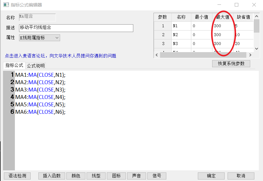 如何修改MA的最大值。 (文华财经)投资者咨询:如何修改MA的最大值。 (文华财经)来源:文华财经 日期:2020-10-16 23:35 如何修改MA(移动平均线)的最大值。(目前最大300)技术人员回复日期:2020-10-17 8:11 菜单 系统工具-》指标管理器-》趋势分析-》MA组合 如图位置修改参数的最大值就可以了 文件名:1.png