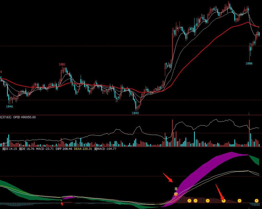 DRAWICON(周DIF>=0 AND CROSS(DIF,DEA) AND C>=MA250,2,11);//绿点