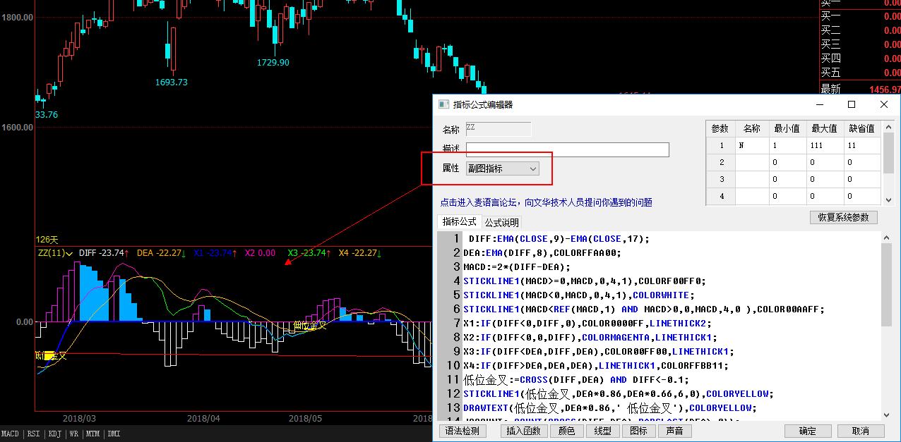 底背离:=REF(CLOSE,A1+1)>CLOSE AND DIFF>REF(DIFF,A1+1) AND CROSS(DIFF,DEA);