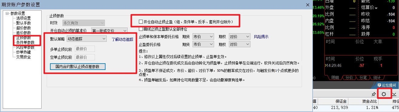 移动止损问题 (文华财经)投资者咨询:移动止损问题 (文华财经)来源:文华财经 日期:2020-10-15 14:52 WH7为什么开仓后不能自动移动止损,必须要手动,怎么设置,另外画线下单开仓后也必须手动启动止损。技术人员回复日期:2020-10-15 14:56下单板右侧设置-》止损参数,勾选“开仓自动止损止盈”同时设置好默认策略和点差参数,后续手动下单成交后就可以自动生成止损单了画线下单自动止损,需要在条件单参数这里,启用画线下单自动止损您了解下 文件名:1.jpg