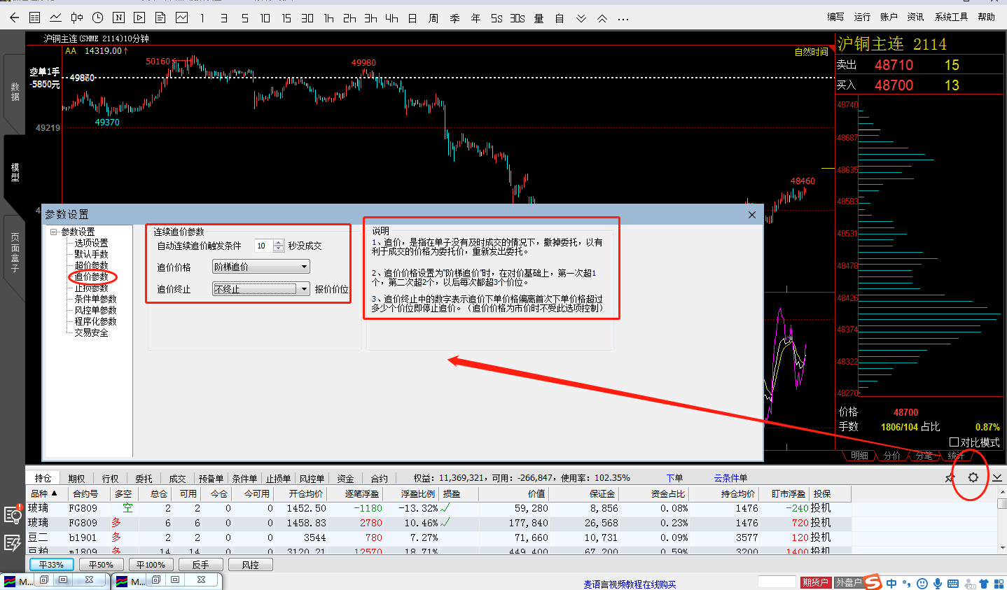 这样的代码如何写 (文华财经WH8赢智V8.2)投资者咨询:这样的代码如何写 (文华财经WH8赢智V8.2)来源:文华财经 日期:2018-8-21 13:49 平仓(或开仓)没有平(开)了,撤单后继续平仓(或开仓),直到平仓(或开仓)。技术人员回复日期:2018-8-21 14:20 核实您的思路: 1、您的开仓,平仓条件是什么? 2、“平仓没有平了”指的是委托价格没有优势形成了挂单吗? 3、“撤单后继续平仓”,挂单多长时间撤单?投资者咨询:这样的代码如何写 (文华财经WH8赢智V8.2)来源:文华财经 日期:2018-8-21 13:49就是追价,直到成交技术人员回复日期:2018-8-21 15:02 参考: RSV:=(CLOSE-LLV(LOW,9))/(HHV(HIGH,9)-LLV(LOW,9))*100;K:SMA(RSV,3,1);D:SMA(K,3,1);CROSS(K,D),BK;CROSSDOWN(K,D),SP;AUTOFILTER; SETALLSIGPRICETYPE(TRACING_ORDER);//所有信号都使用自动连续追价功能 之后下单版中设置追价的方式,参考: