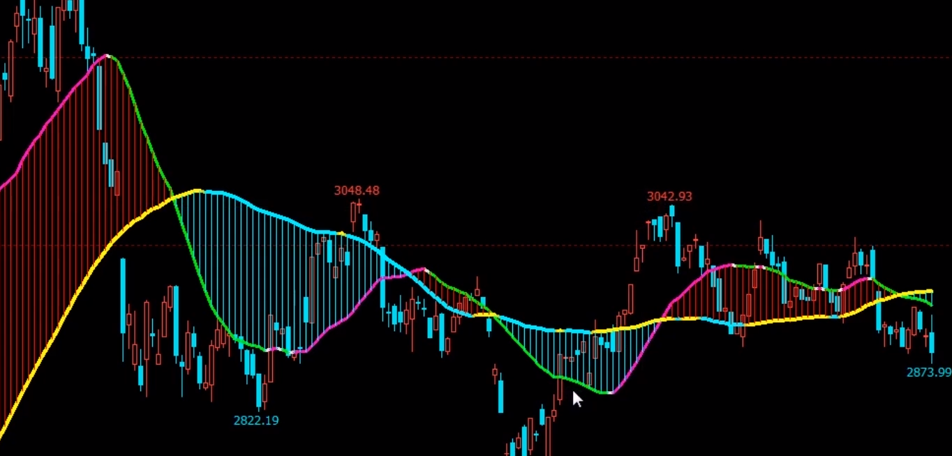 20日均线上升时用粗红色线,下降时用粗绿色线;60日均线上升时用粗黄色线,下降时用粗蓝色线;20日均线与60日均线包围形成的上升趋势面积用红色竖纹标识,而20日均线与60日均线包围形成的下降趋势面积用蓝色竖纹标识。