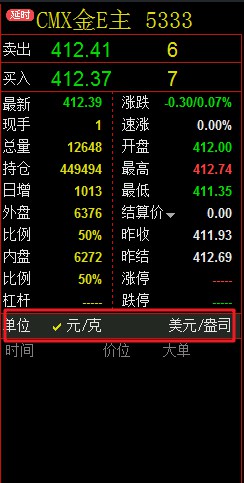 需要CMX金和银的换算工具 (文华财经)投资者咨询:需要CMX金和银的换算工具 (文华财经)来源:文华财经 日期:2020-10-19 10:20 需要CMX金和银的换算工具技术人员回复日期:2020-10-19 10:24 k线图右侧盘口,可以切换计量单位 文件名:01.jpeg