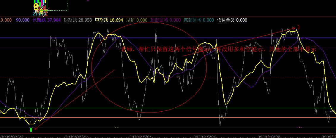 见顶:=(REF(中期线,1)>85 AND REF(短期线,1)>85 AND REF(长期线,1)>65) AND CROSS(长期线,短期线) ;