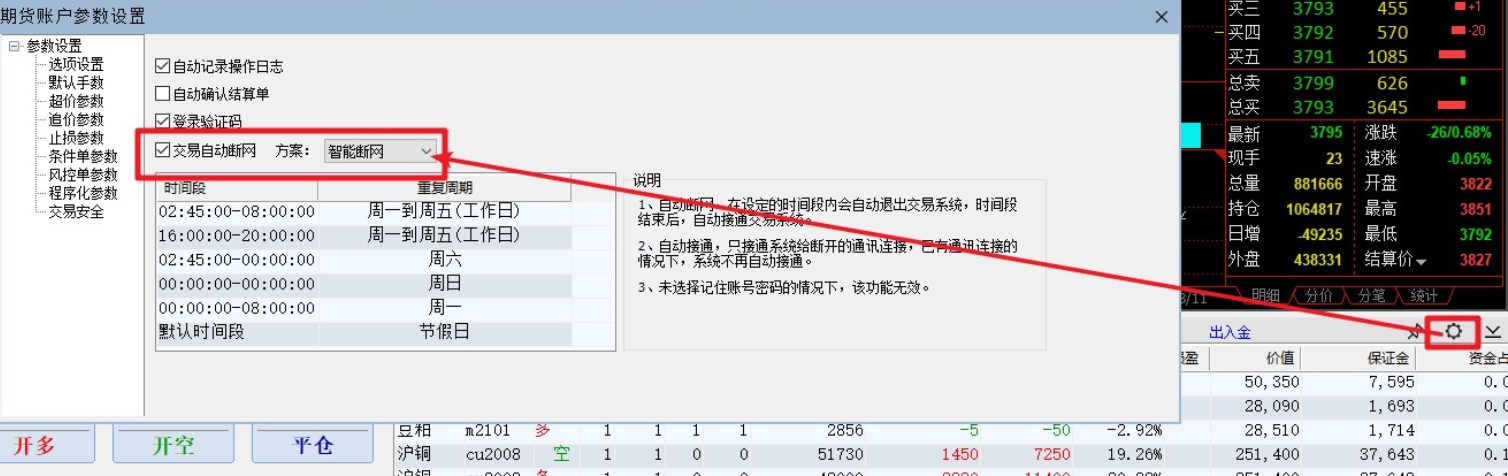 如何做到不操作,页面盒子和账户自动运行 (文华财经)投资者咨询:如何做到不操作,页面盒子和账户自动运行 (文华财经)来源:文华财经 日期:2020-10-23 0:28 今天就是我早上打开打开盒子与资金账户运行,到了下午盒子开了多单。但是晚上我10半才到家,发现资金账户关闭了,盒子无法自动平多仓、开空仓,导致一手白银亏了1500元。就想问一下:如何做到只要白天打开盒子与资金账户运行,电脑一直不关闭、也不做任何操作,到了晚上九点(或者到了第二天早上九点)盒子与资金账户还可以同步自动运行开平仓。 技术人员回复日期:2020-10-23 8:09 如图设置交易自动断网就可以了 文件名:1.jpg