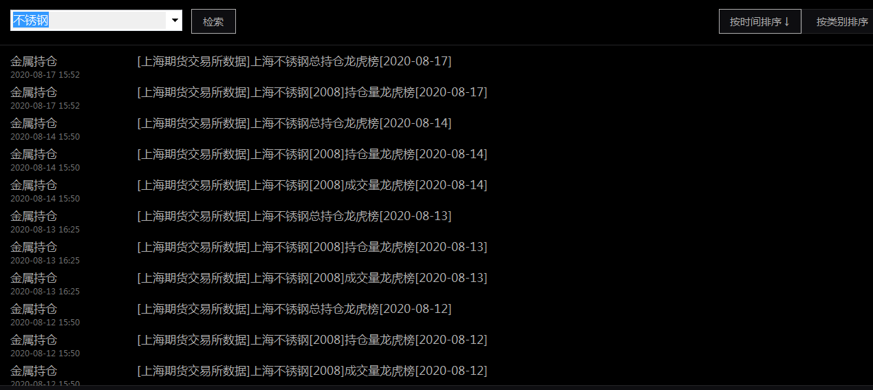 不锈钢持仓数据 (文华财经)投资者咨询:不锈钢持仓数据 (文华财经)来源:文华财经 日期:2020-10-22 17:12不锈钢持仓数据怎么只有8月份? 文件名:screenshot20201022171046.png 技术人员回复日期:2020-10-22 17:14 这里不锈钢合约没有8月17日后的持仓龙虎榜,是因为交易所没有公布数据 可以进入交易所官网看下 http://www.shfe.com.cn/statements/dataview.html?paramid=kx
