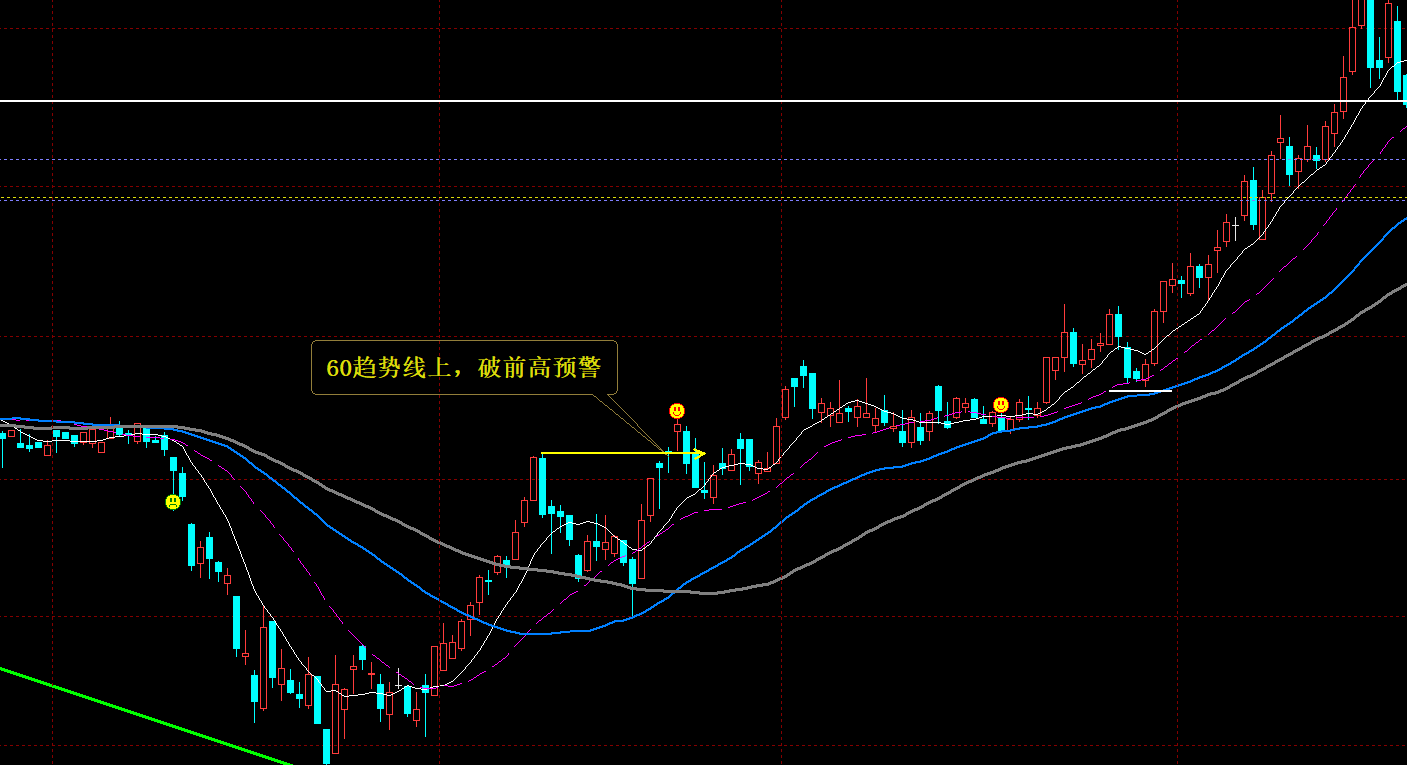 老师,我要求的是,60均线上也要标出高低点,突破前高预警,60均线下突破前低预警。试用了之后60均线之上就标一个最高点,高低点连线不符合。