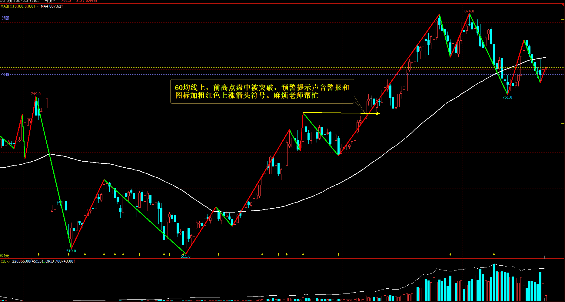 那有其他近似的高低点突破近似指标不,我只要求60均线上,前高突破预警,60均线下,前低突破预警。价格触及60均线预警。