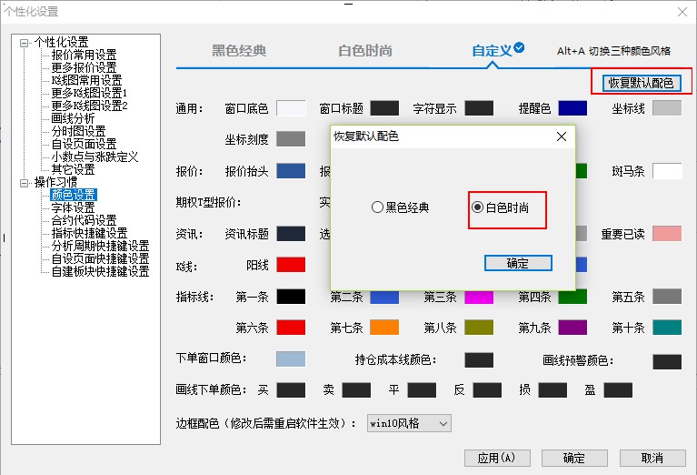 你好,右边的现价提示横线颜色设置 (文华财经)投资者咨询:你好,右边的现价提示横线颜色设置 (文华财经)来源:文华财经 日期:2020-10-20 20:36 你好,现价右边的跟随提示横线如何修改下颜色和粗细,谢谢技术人员回复日期:2020-10-20 20:39 菜单 个性化-》个性化设置-》颜色设置-》自定义,这里修改提醒色,但线型调整不了的投资者咨询:你好,右边的现价提示横线颜色设置 (文华财经)来源:文华财经 日期:2020-10-20 20:36 我用的白色经典。是不是如果选择自定义,别的也都修改了。能写一个指标添加到自定义里么技术人员回复日期:2020-10-20 20:53 自定义颜色-》默认配色,选择白色经典再修改提醒色就可以了 文件名:23.jpg