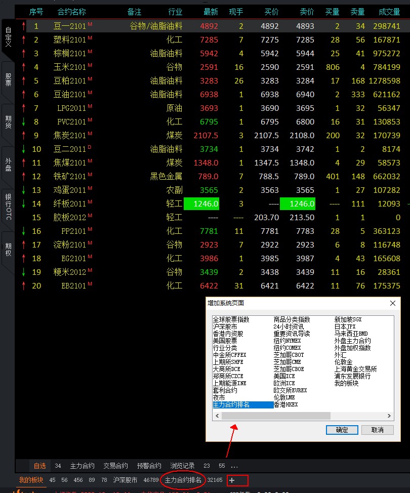 主力合约排名 (文华财经)投资者咨询:主力合约排名 (文华财经)来源:文华财经 日期:2020-10-20 18:26 麻烦问个页面操作的问题 怎么把 主力排行 这个 复制到 画圈圈的那里 文件名:微信截图_20201020182338.png 技术人员回复日期:2020-10-20 18:32 主力合约报价可以增加到系统页面的 如下图 文件名:23.jpg
