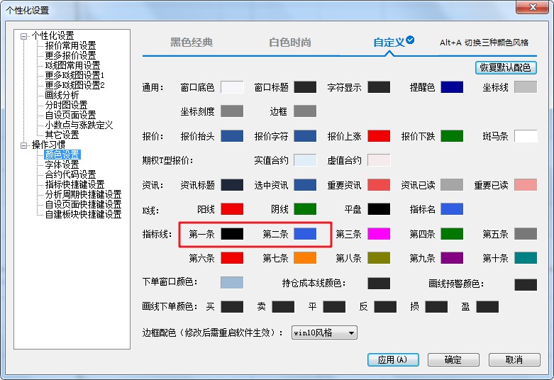 请问老师窗口设置颜色问题? (文华财经)投资者咨询:请问老师窗口设置颜色问题? (文华财经)来源:文华财经 日期:2020-11-17 8:39 请问老师那里能够设置白底的分时图走向中,分均设置为黄线,分时线设置为白线和信达通的类似。技术人员回复日期:2020-11-17 8:43 菜单 个性化-》个性化设置-》颜色设置-》自定义, 点击右上方的恢复默认配色-白色时尚,然后在此基础上调整前两条指标线颜色即可。 文件名:01.jpeg