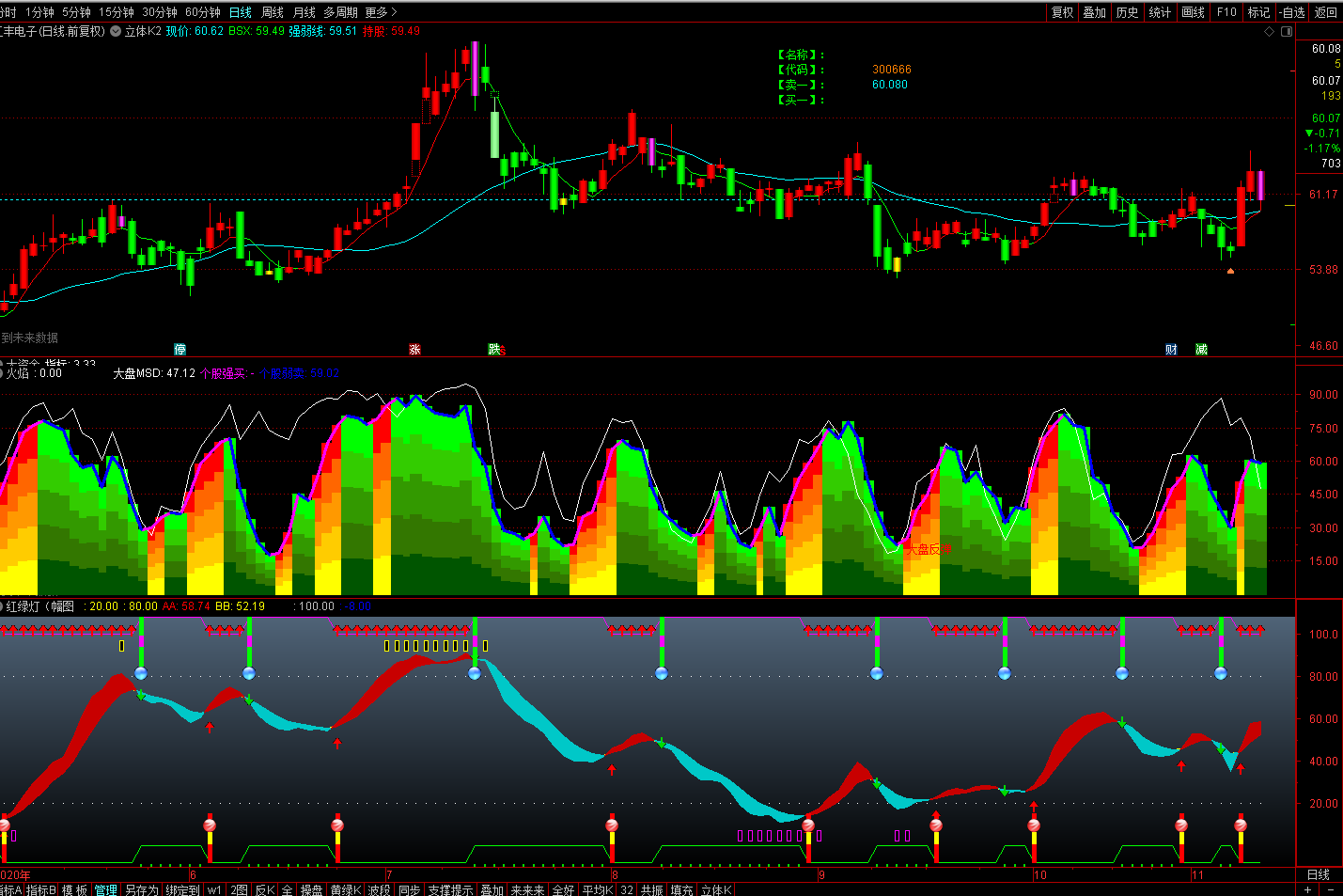 个股弱卖:IF(K3,个股强,NULL),COLORBLUE,LINETHICK3;