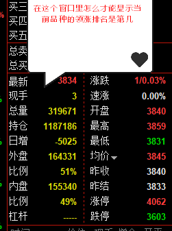 涨跌排序显示 (文华财经)投资者咨询:涨跌排序显示 (文华财经)来源:文华财经 日期:2020-11-14 10:04 文件名:456.png 技术人员回复日期:2020-11-14 10:09 盘口显示的是该合约自己的报价内容。 排序的话,不同范围排序也不同,这个不适合在盘口中显示。 您需要到报价列表点击涨跌来进行排序查看。投资者咨询:涨跌排序显示 (文华财经)来源:文华财经 日期:2020-11-14 10:04 谢谢 投资者咨询:涨跌排序显示 (文华财经)来源:文华财经 日期:2020-11-14 10:04 就是想把当前品种在主力合约排名里面的那个排序号,显示到这个窗口中,可以吗技术人员回复日期:2020-11-14 10:23 显示不了的,排序也是根据不同分类排序名称不同,需要在报价列表查看。