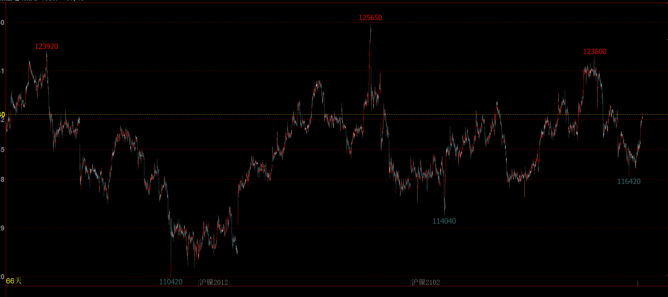 同样极度压缩5分钟k,沪镍主连,朋友发给我的截图,也是文华软件,显示的高低点,我的压缩图显示的高低点没那么多。我是设置有显示未回补的跳空缺口的,但即使取消这个设置,也没法显示那么多高低点。