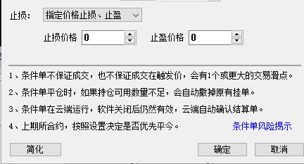 条件单附加损盈单,指定价格止损、止盈,意思是到达设置的止损价格、止盈价格,触发损盈单,