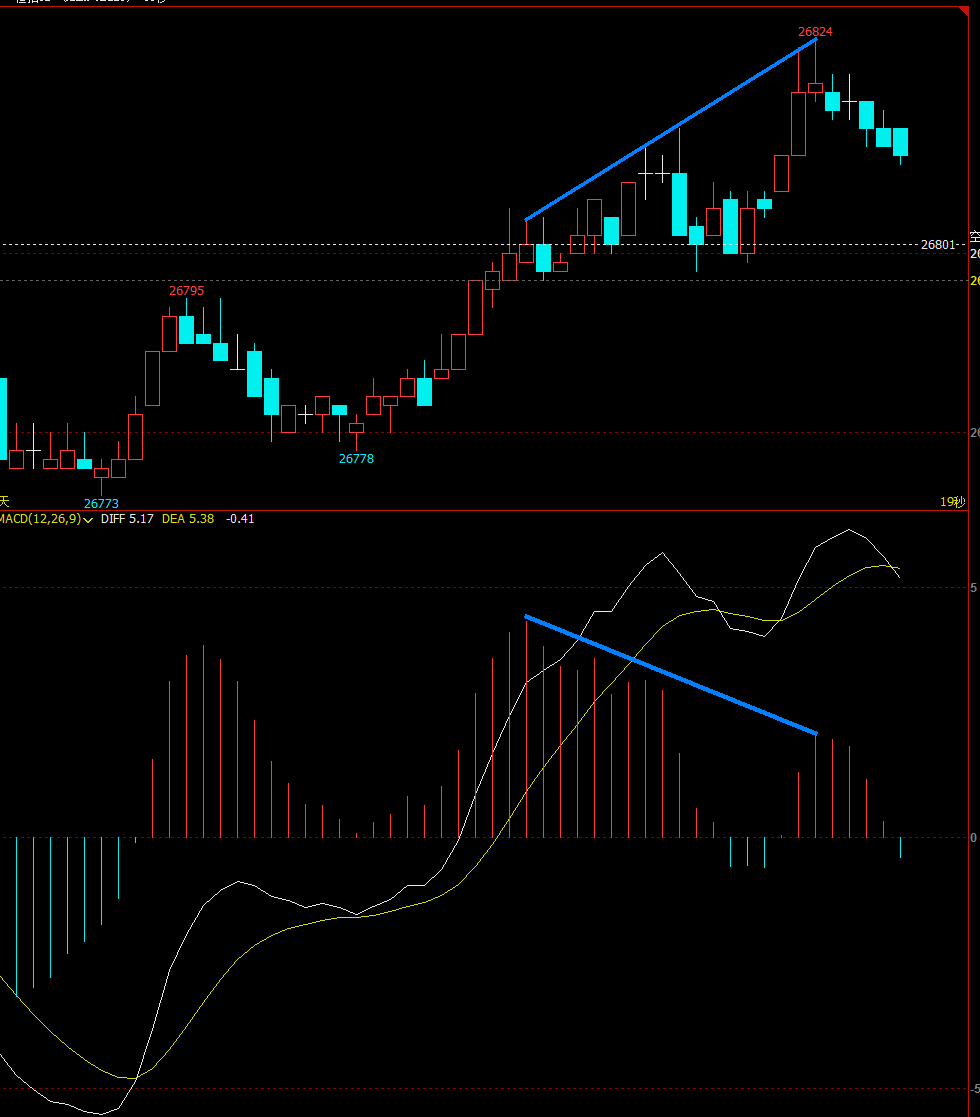 这是个k线收价格跟macd红绿柱背离指标,找出前一段红柱的最长的那根开始,跟下一段红柱最长那根比较,下一根红柱缩短了,但对应的k线价格创新高的,就可以画线,您可以加入未来函数来计算