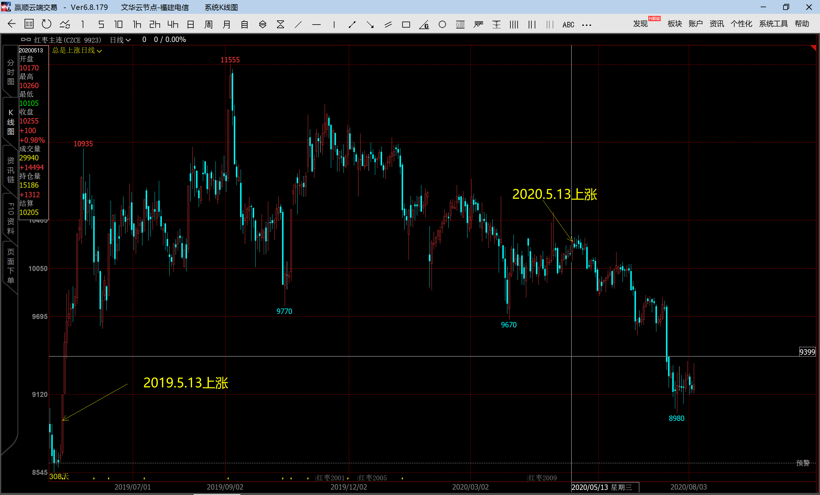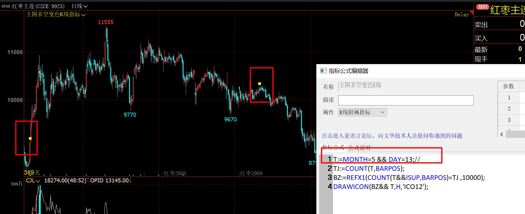 老师,请写个某月某日总是上涨标注 (文华财经)投资者咨询:老师,请写个某月某日总是上涨标注 (文华财经)来源:文华财经 日期:2020-12-3 18:23 老师,请写个:在合约历年历史中,某月某日总是上涨的K线,标记个黄点,谢谢 技术人员回复日期:2020-12-3 18:25 参考: T:=MONTH=12 && DAY=1;//12月1日TJ:=COUNT(T,BARPOS);BZ:=REFX1(COUNT(T&&ISUP,BARPOS)=TJ ,10000);DRAWICON(BZ&& T,H,'ICO12'); 投资者咨询:老师,请写个某月某日总是上涨标注 (文华财经)来源:文华财经 日期:2020-12-3 18:23 老师,图中都是5.13日上涨,没有标记 文件名:qq截图20201203220317.png 技术人员回复日期:2020-12-3 22:15 我们这边测试是标注的。您核实下编写,看下日期 是否改成5月13日了。 文件名:搜狗截图20201203223621.jpg