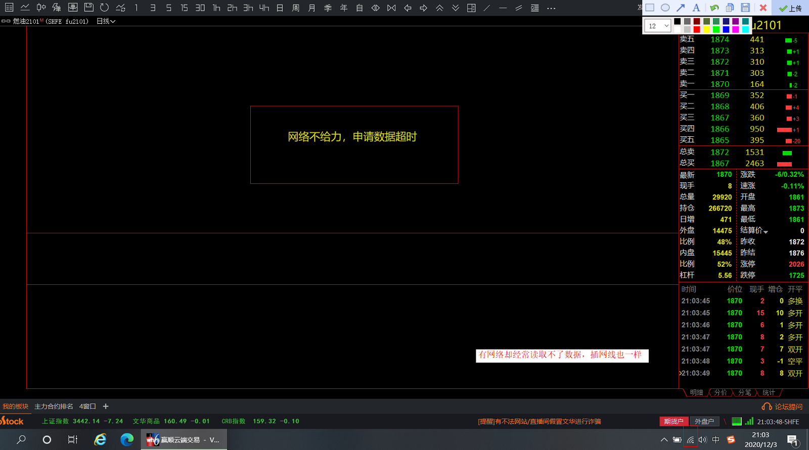 申请数据超时(广东电信) (文华财经)投资者咨询:申请数据超时(广东电信) (文华财经)来源:文华财经 日期:2020-12-3 21:05插网线,连wifi都读取不了数据 文件名:screenshot20201203210430.png 技术人员回复日期:2020-12-3 21:10 超时跟您本地网络质量不佳有关, 菜单 系统工具-》优选行情服务器,ping值检测,选择ping值最小的服务器登录看下。同时也关闭本地杀毒软件、防火墙,重启路由器试试。