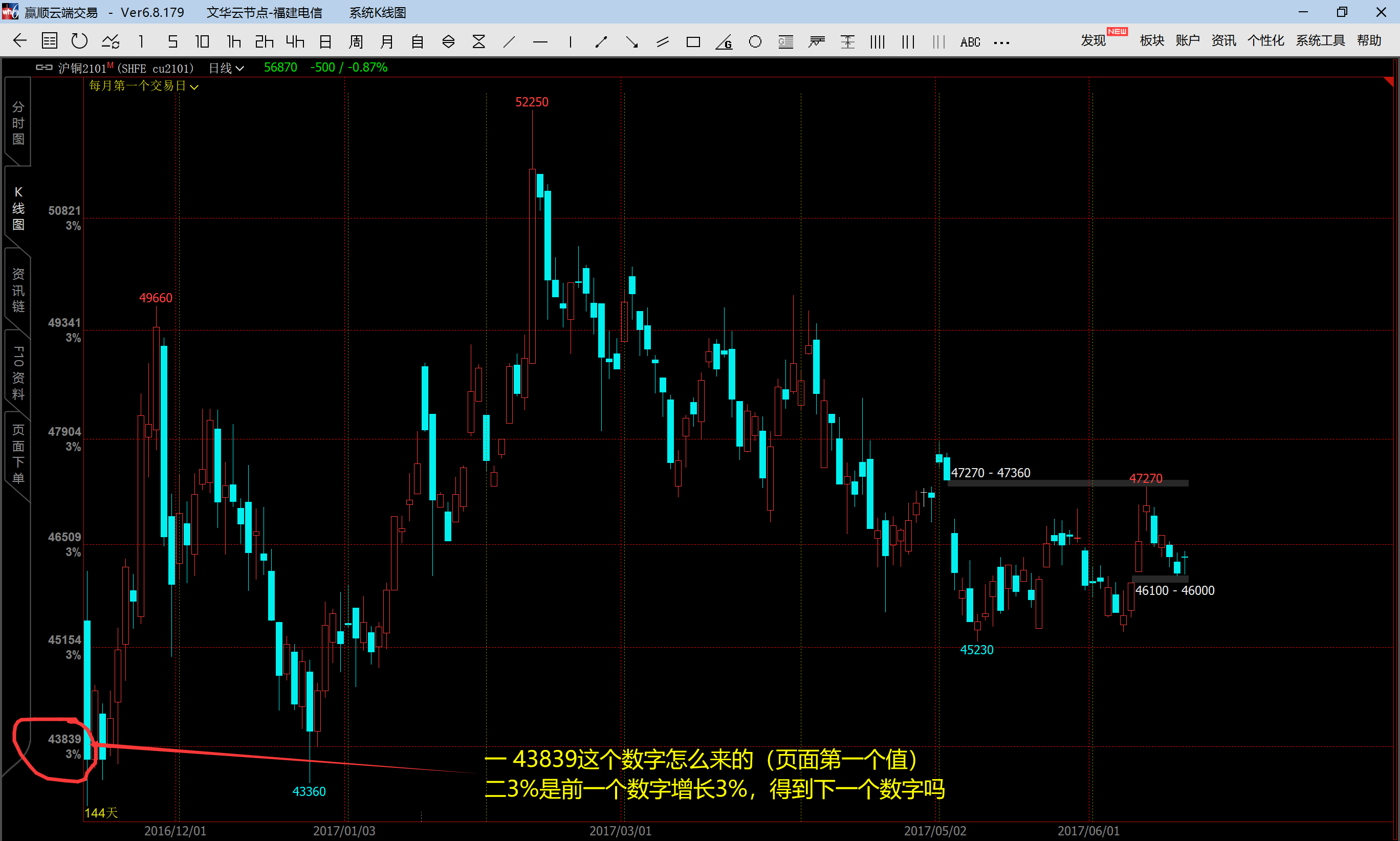 老师,有两个纵坐标刻度的问题 (文华财经)投资者咨询:老师,有两个纵坐标刻度的问题 (文华财经)来源:文华财经 日期:2020-12-3 18:11 老师,有两个纵坐标刻度的问题 文件名:qq截图20201203180911.png技术人员回复日期:2020-12-3 18:14第二个标注您理解的对,每相邻2个坐标刻度间,上面的刻度比下面的刻度增长3%。 等比坐标,是以最新价前一根K线的收盘价为基准线,自适应比例,以相同比例递增或是递减。 也就是说,最下面这条坐标线不是基准,而是根据最新价前一根K线的收盘价递减得到的。