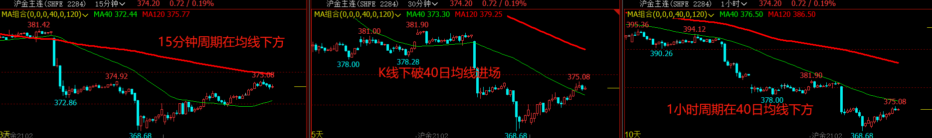 条件一、30分钟周期K线收盘后15分钟周期价格低于40日K线,低于120日K线(40日均线和120日均线谁大于谁无所谓)