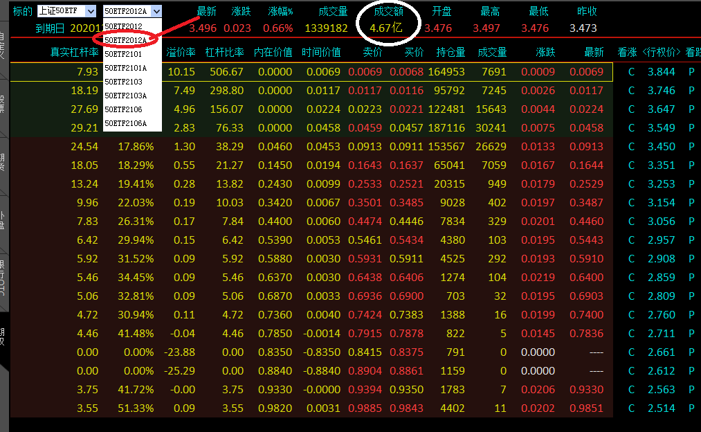 期权T型报价上方显示的期权标的合约的报价,也就是说1楼您标注的是50ETF基金的成交额。