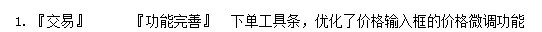 咨询-价格输入框的价格微调功能 (文华财经)投资者咨询:咨询-价格输入框的价格微调功能 (文华财经)来源:文华财经 日期:2020-12-3 10:18具体优化的功能是什么?我想体验。 文件名:screenshot20201203101459.png 技术人员回复日期:2020-12-3 10:23这部分是完善了价格输入框通过滚轮或者点击上下箭头调节委托价格的显示机制。 目前的机制为:都按最小变动价的小数点位数显示,小数的最后一位是0也会显示。 这个完善让交易者更清晰看到小数位数较多的合约价格。