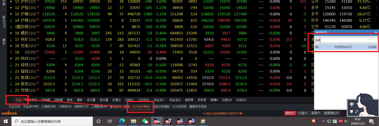 我是按60,不行,另外,老师,那你的第一个方法(点击一下主力合约排名页面下方的“行业”按钮,就可以恢复原始排序了),但我点主力合约排名,为何没有行业按钮呢