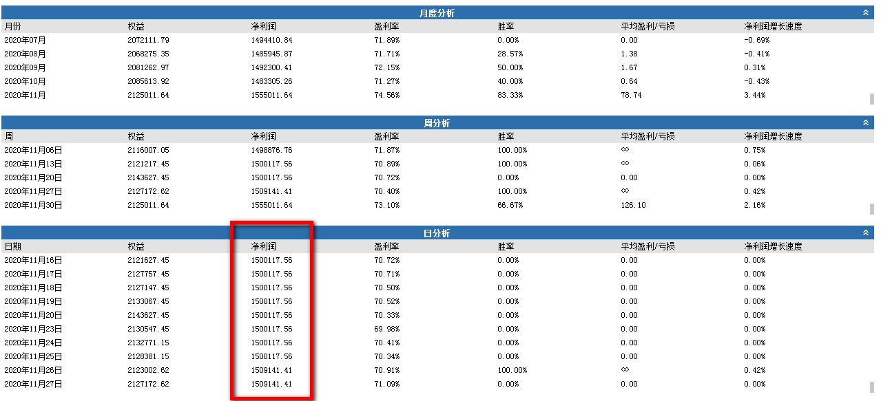 请具体看看组合回测的数据,连续8天、每天盈利都是1500117.56元,每天都是相同,除了软件出错,有可能么?
