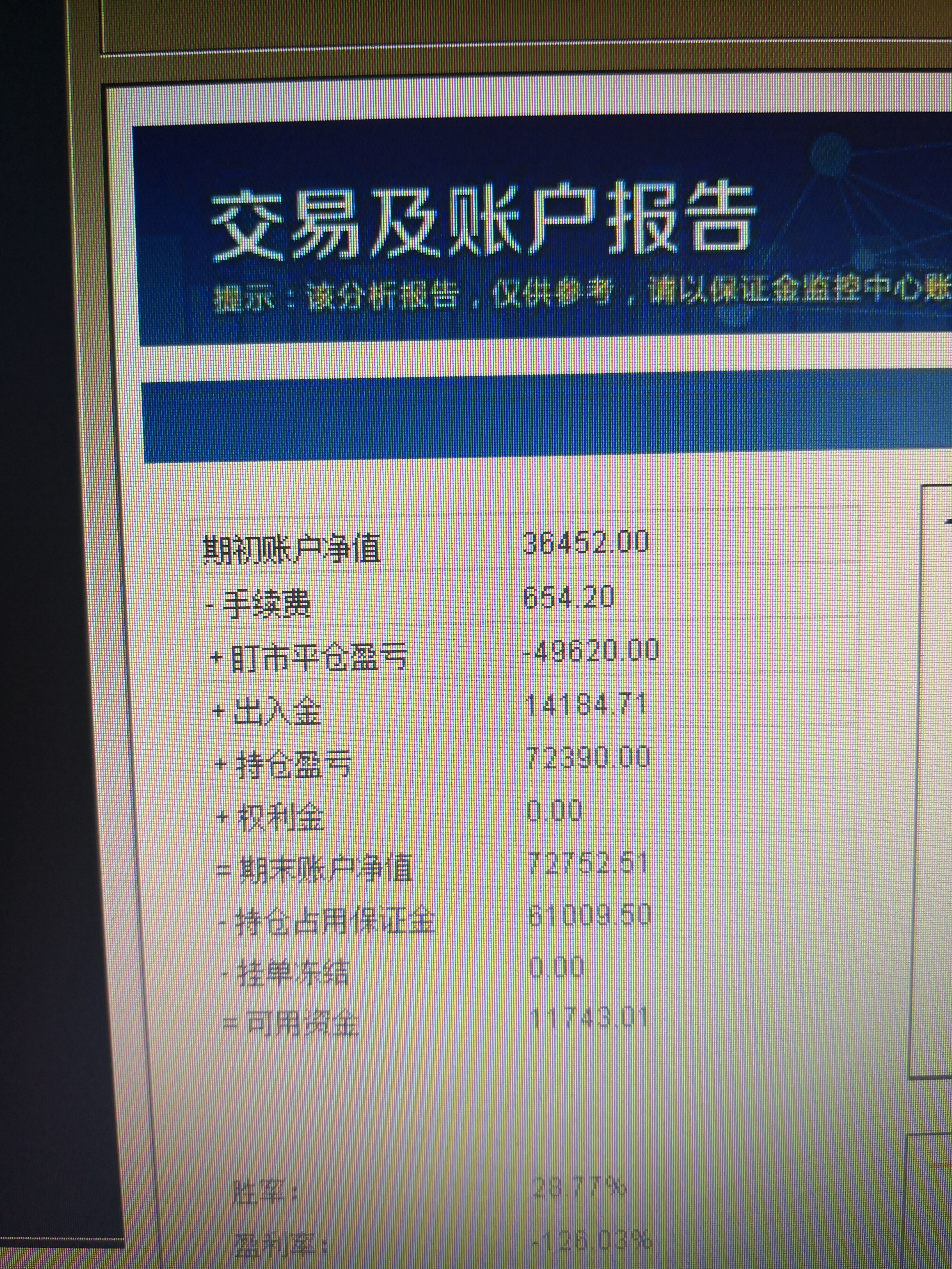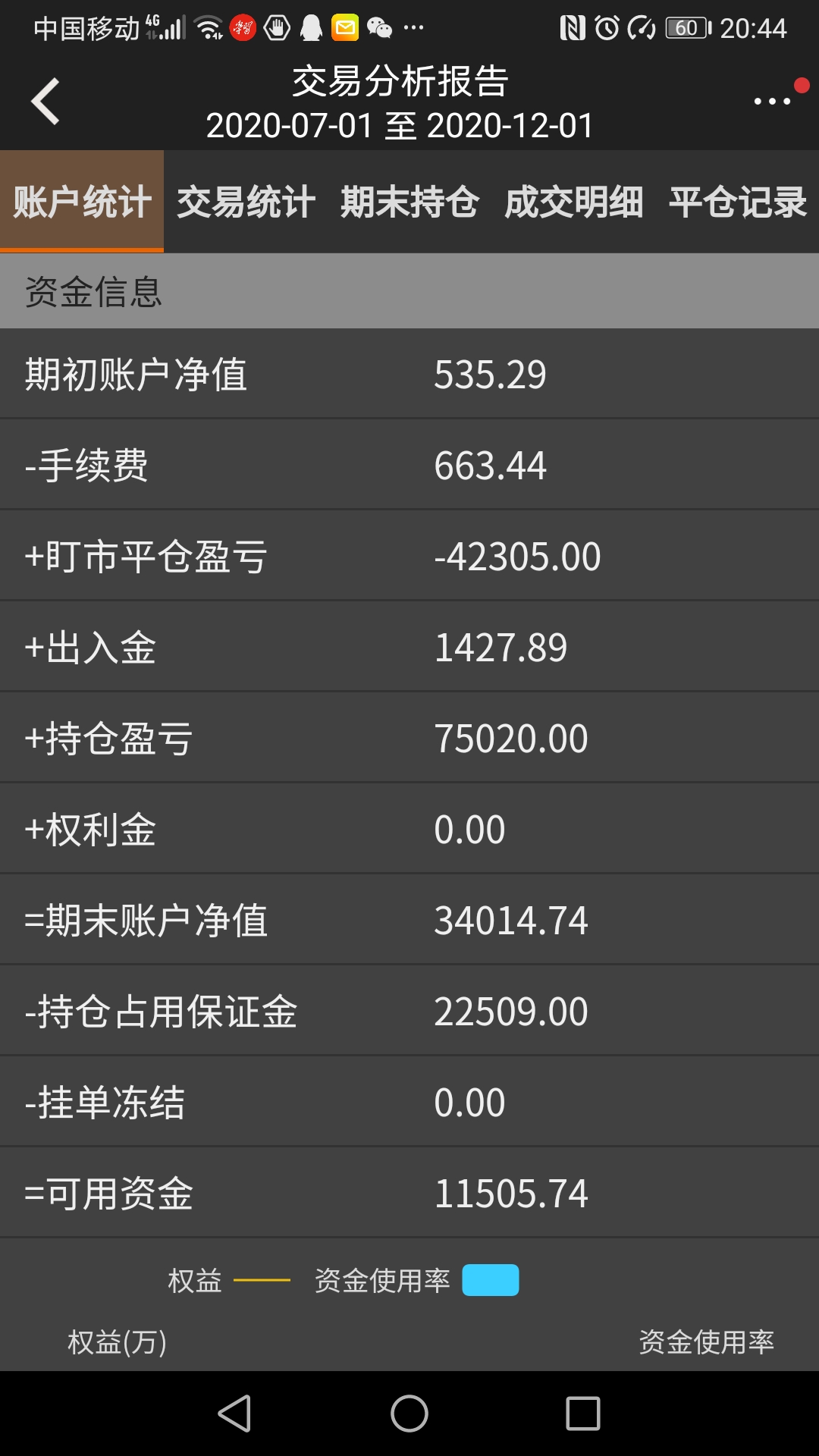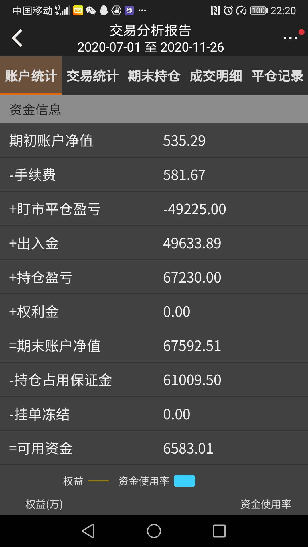 在这两张图里,可用资金,持仓占用资金,期末净值和持仓盈亏的金额都是相等的
