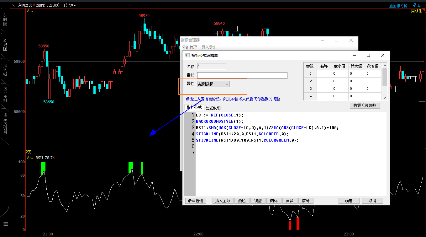 STICKLINE(RSI1<20,0,RSI1,COLORRED,0);