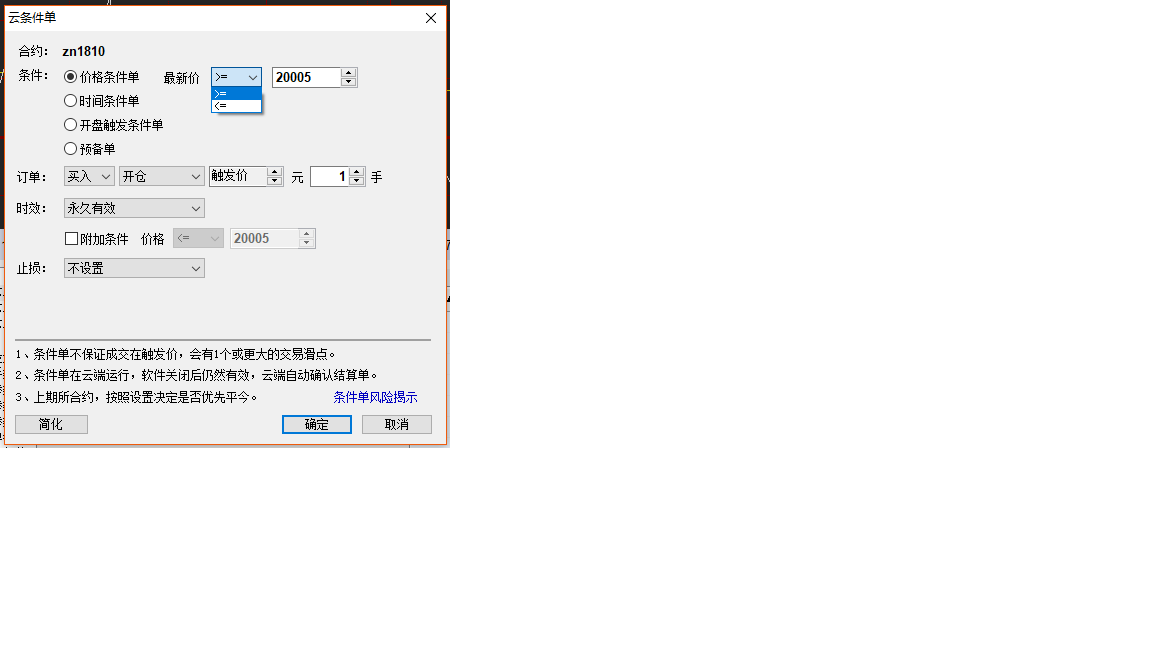 去掉条件单设置修改框的>,<判断,只保留>=,<=,用来确定触发价的数值