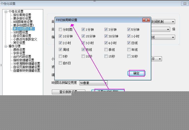 多周期同列怎么把内容改过来? (文华财经WH6赢顺V6.7)投资者咨询:多周期同列怎么把内容改过来? (文华财经WH6赢顺V6.7)来源:文华财经 日期:2018-8-18 20:09 比如他现在打开都是固定得,我想设置成自己的使用周期技术人员回复日期:2018-8-19 9:32设置下F8切换周期就可以了 软件右上角 个性化》个性化设置》更多K线图设置2,如图设置下,勾选想要查看的周期即可