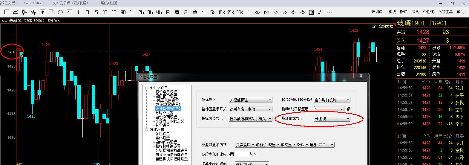 投资者咨询:如何在K线图最右侧的最新价黄线上显示最新成交价格? (文华财经WH6赢顺V6.7)