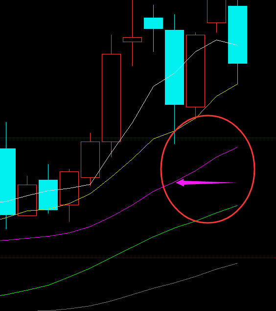 您那个粉线的定义是:2倍的白线-4四周期内白线最高值也就是说粉线最大等于白线,不会大于白线的,所以不会有白线死叉紫线的情况