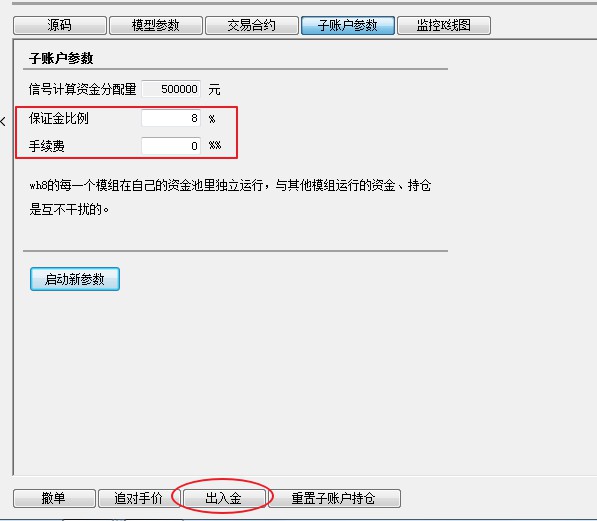 关于程序化运行模组中子账户参数的变更 (文华财经随身行iPhone 5.4.5)投资者咨询:关于程序化运行模组中子账户参数的变更 (文华财经随身行iPhone 5.4.5)来源:文华财经 日期:2018-8-16 9:58 老师,我现在想把已经在分区运行中的子账户参数里面的资金分配量和保证金比例以及手续费变更过来,有什么办法在不影响现在正在运行的情况下变更么?技术人员回复日期:2018-8-16 10:19 1. 资金分配量从装入模组时就已经确定了,用这部分资金全自动运行 装入模组后,直接出入金,就可以调整当前模组的资金量了 2. 如图调整保证金和手续费后,启用新参数就可以了