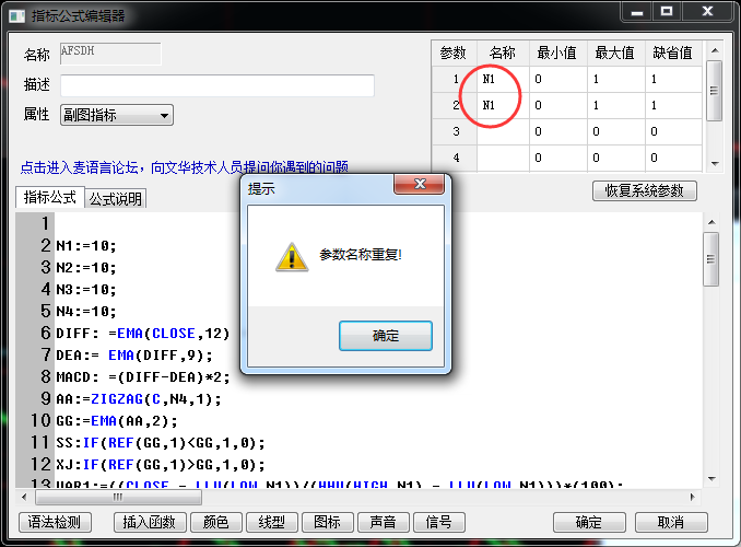 顶背离:=IF(REF(HIGH,A2+1)<HIGH AND REF(DIFF,A2+1)>DIFF AND CROSS(DEA,DIFF),1,0);