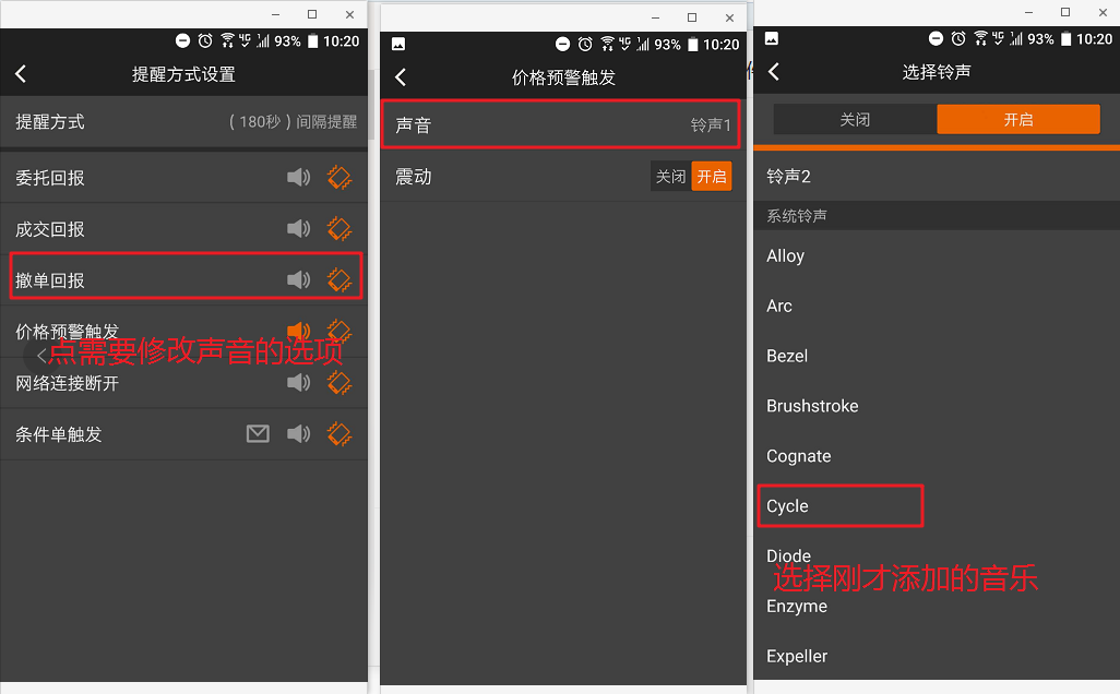 随身行手机软件 (文华财经WH6赢顺V6.7)投资者咨询:随身行手机软件 (文华财经WH6赢顺V6.7)来源:文华财经 日期:2018-8-15 10:07 随身行手机软件交易提醒的音乐可以自定义吗,就是不用系统的。技术人员回复日期:2018-8-15 10:23 系统铃声指的是您手机的系统铃声 想要自定义音乐,需要您在在手机系统设置中添加音乐,然后按下面步骤选择您添加的音乐就可以了 主菜单》系统设置》提醒方式设置,按截图操作一下就额可以了