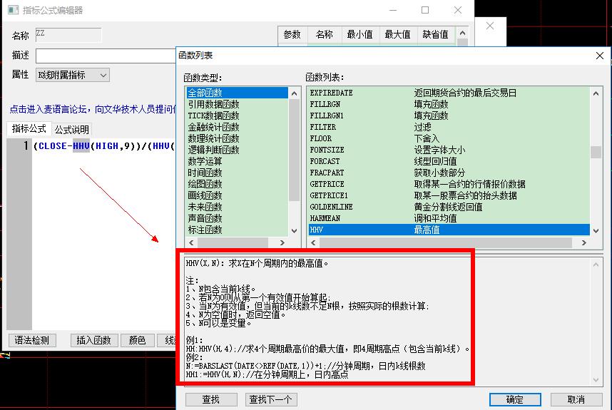 请问老师, 函数意义 (文华财经WH6赢顺V6.7)投资者咨询:请问老师, 函数意义 (文华财经WH6赢顺V6.7)来源:文华财经 日期:2018-8-14 11:00 (CLOSE-HHV(HIGH,9))/(HHV(HIGH,N)-LLV(LOW,9))*100; HHV:LLV这两个意思是什么技术人员回复日期:2018-8-14 11:04HHV(HIGH,9)是指取包括当根在内的9根K线中最高价HIGH的最高值,LLV就是取N周期内最低值 两个函数的具体用法,可以双击函数右键查看函数说明了解一下