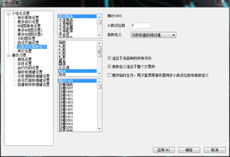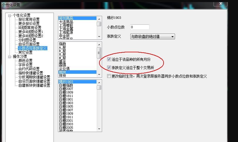 怎样把所有自选品种设置统一的涨跌定义 (文华财经WH6赢顺V6.7)投资者咨询:怎样把所有自选品种设置统一的涨跌定义 (文华财经WH6赢顺V6.7)来源:文华财经 日期:2018-8-31 9:20 怎样把所有自选品种设置为统一按照昨天收盘绝对值作为涨幅定义,需要一个品种一个品种更换吗?有没有办法一次全部更改?技术人员回复日期:2018-8-31 9:27 个性化设置中勾选前两个选项,这样在每个自选中分别对包含市场的任意合约设置一次后就会对该市场全部合约生效了 这样分别设置下市场就可以了 注意不要勾选第三项更改临时生效选项,后续就会保存住了