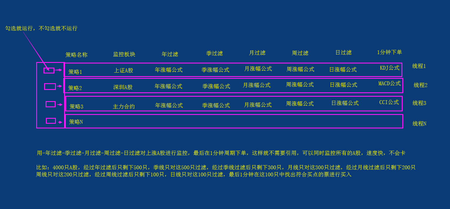 不是把选好的股票再进行程序化交易,是把所有的A股,通过年-季-月-周-日过滤后,直接在1分钟周期下单咯,这是一条完整的交易策略
